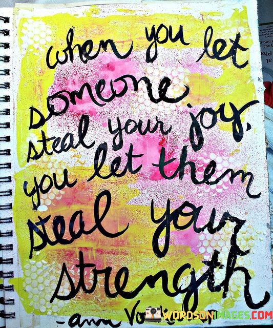 The quote "When you let someone steal your joy, you let them steal your strength" highlights the profound connection between our emotional well-being and our ability to face challenges with resilience and determination. It reminds us of the importance of safeguarding our happiness and inner peace, as they are fundamental sources of strength and empowerment in navigating life's difficulties. Joy is a state of inner contentment and happiness that comes from within. It is not dependent on external circumstances or the actions of others. When we allow someone else to steal our joy, it means we are giving them the power to control our emotions and outlook on life. It can happen when we allow negative comments, criticism, or toxic behaviors of others to affect our sense of self-worth and happiness. By letting someone steal our joy, we unintentionally weaken ourselves emotionally and mentally. Our strength lies in our ability to maintain a positive mindset, even in the face of adversity. When we allow external influences to dampen our spirits, we become more susceptible to feelings of doubt, fear, and insecurity, which can hinder our ability to overcome challenges. Moreover, joy is a source of resilience and empowerment. When we are happy and content, we are better equipped to handle stress, solve problems, and face difficulties with a clear and focused mind. Our emotional well-being directly impacts our cognitive abilities and decision-making skills, allowing us to approach challenges with a sense of clarity and purpose. Protecting our joy is not about avoiding difficult situations or ignoring the actions of others. It is about cultivating inner strength and emotional resilience, so we can respond to life's challenges in a healthy and constructive manner. It involves setting boundaries, surrounding ourselves with positive influences, and focusing on the things that bring us happiness and fulfillment. In conclusion, "When you let someone steal your joy, you let them steal your strength" emphasizes the importance of protecting our emotional well-being and inner happiness. Joy is not only a source of contentment but also a wellspring of strength and resilience. By safeguarding our joy and not allowing others to negatively impact our happiness, we preserve our inner strength and ability to face life's challenges with grace and determination. Letting go of negative influences and focusing on cultivating joy empowers us to navigate difficulties with a positive mindset and a sense of empowerment, allowing us to emerge stronger and more resilient in the face of adversity.