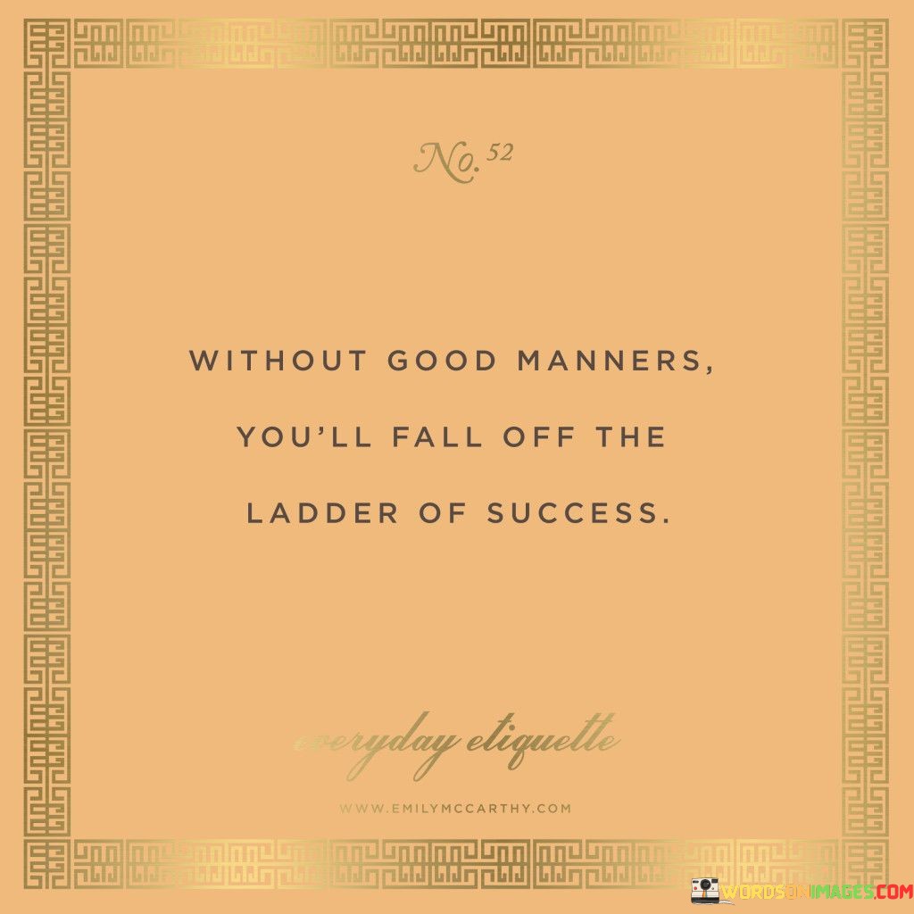 The statement "Without good manners, you'll fall off the ladder of success" succinctly conveys the importance of possessing proper etiquette and respectful behavior in achieving and maintaining success.