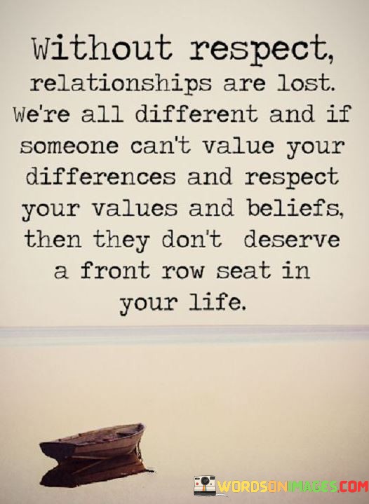 "Without respect, relationships are lost" emphasizes that respect is a fundamental cornerstone of healthy and enduring relationships. It suggests that without respect, relationships can deteriorate or break down. We're all different" acknowledges the diversity and uniqueness of individuals, highlighting that no two people are exactly alike.