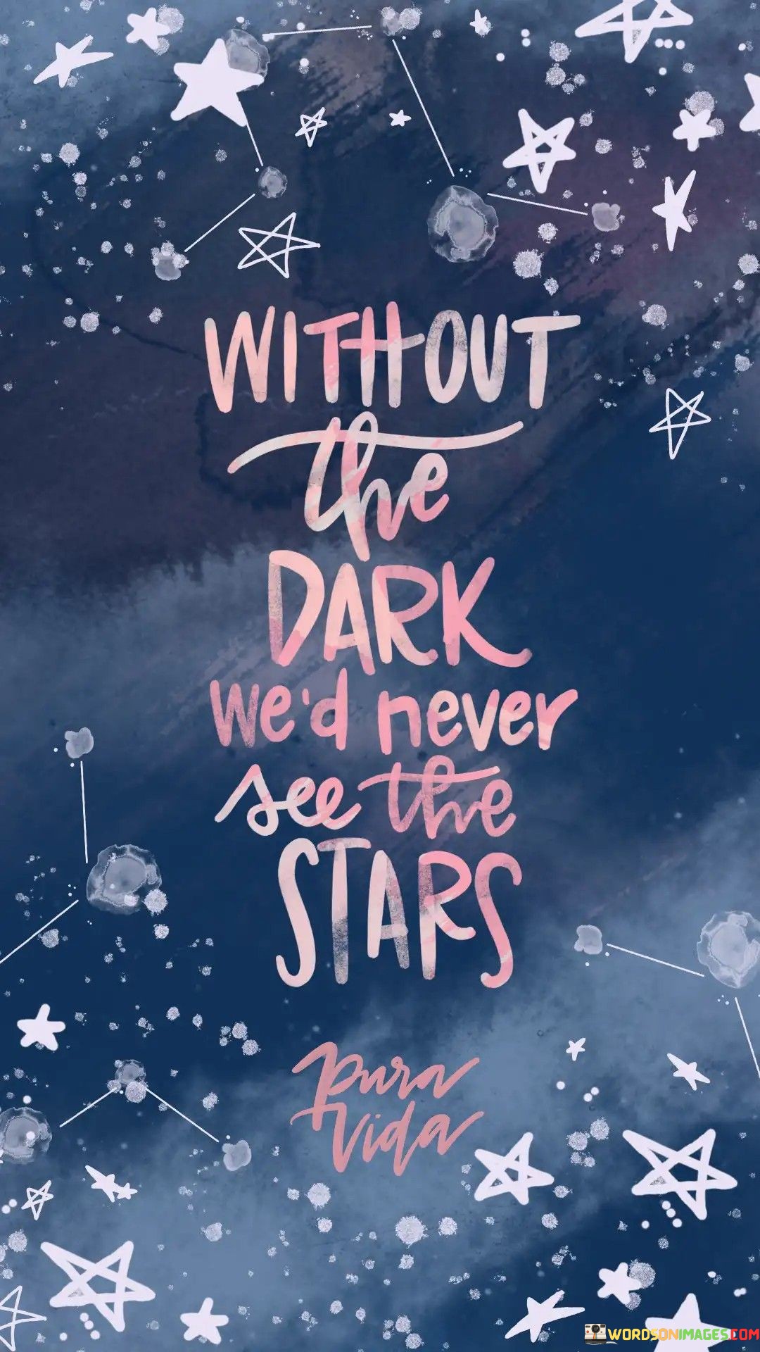 Life is a journey with ups and downs. The quote reminds us that we can find hope and inspiration (the stars) even in difficult times (the dark). It teaches us to embrace challenges as opportunities for growth and learning. So, when life gets tough, keep in mind that it's just a part of the journey towards something beautiful and bright.