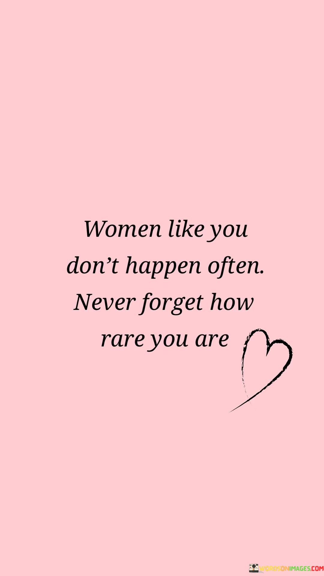 The quote "Women like you don't happen often, never forget how rare you are" is a powerful reminder of the uniqueness and extraordinary qualities possessed by the woman being addressed. It emphasizes the exceptional nature of her character, strength, talents, and individuality. The quote serves as a call to recognize and cherish one's own distinctiveness, reminding women to embrace their worth, value, and the impact they can make in the world.