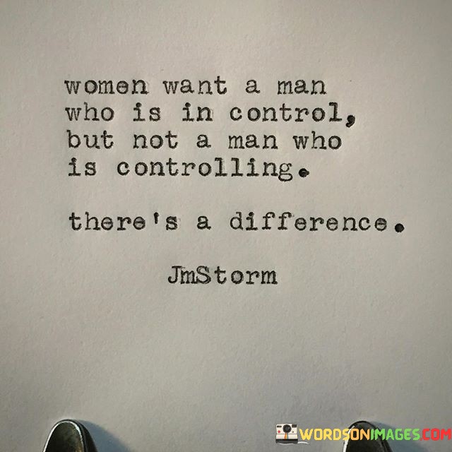 On the other hand, a man who is controlling seeks to exert power over his partner, often disregarding her opinions, desires, and personal boundaries. This behavior reflects an imbalance of power and a lack of respect for the agency and autonomy of the woman in the relationship.Overall, the quote highlights the importance of healthy dynamics and mutual respect in relationships. It emphasizes that women appreciate a partner who can take charge and be assertive when needed, but it should never cross the line into controlling behavior. By valuing the difference between healthy control and controlling behavior, women seek partners who can lead with respect, understanding, and a genuine desire for partnership and collaboration.