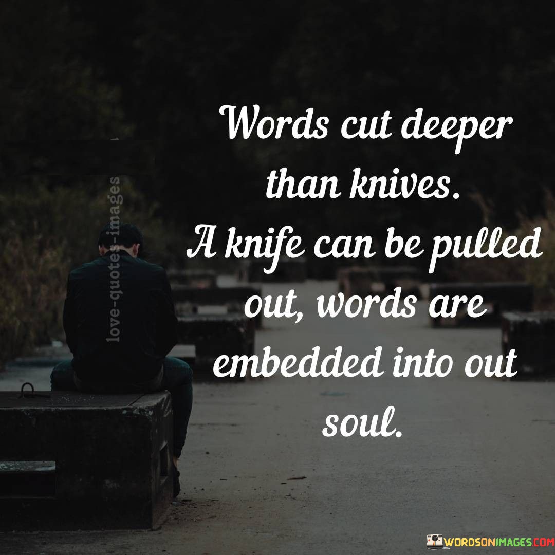 The quote contrasts the impact of words and physical wounds. "Words cut deeper than knives" signifies emotional harm. "Knife can be pulled out" implies temporary physical injury. The quote conveys the lasting emotional damage caused by hurtful words.
