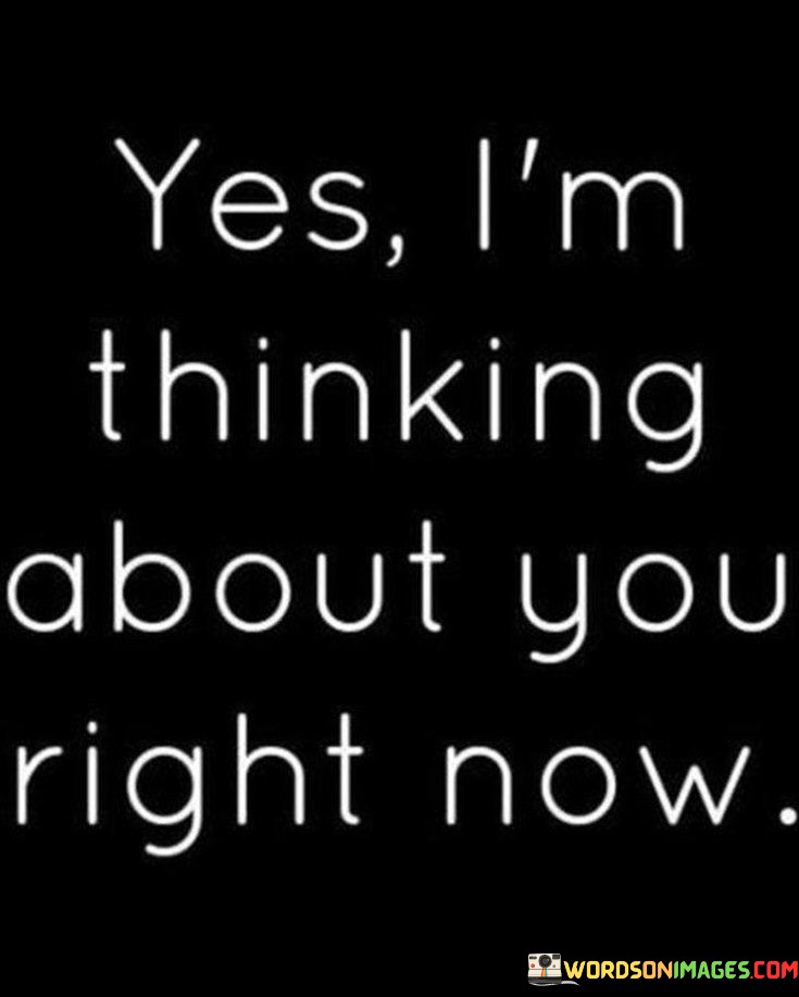 The quote "Yes, I'm thinking about you right now" is a straightforward declaration of someone's current thoughts and feelings towards another person. It expresses a sense of connection and interest in the person being addressed. This statement conveys that at this very moment, the speaker's mind is occupied by thoughts of the individual they are addressing.