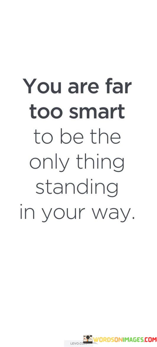 Don't be your own obstacle to success. This quote delivers a powerful message about self-doubt and self-limitation. It suggests that one's intelligence and capabilities should not be the barriers preventing them from achieving their goals. Instead of doubting oneself, it encourages individuals to recognize their own potential and work towards their aspirations.