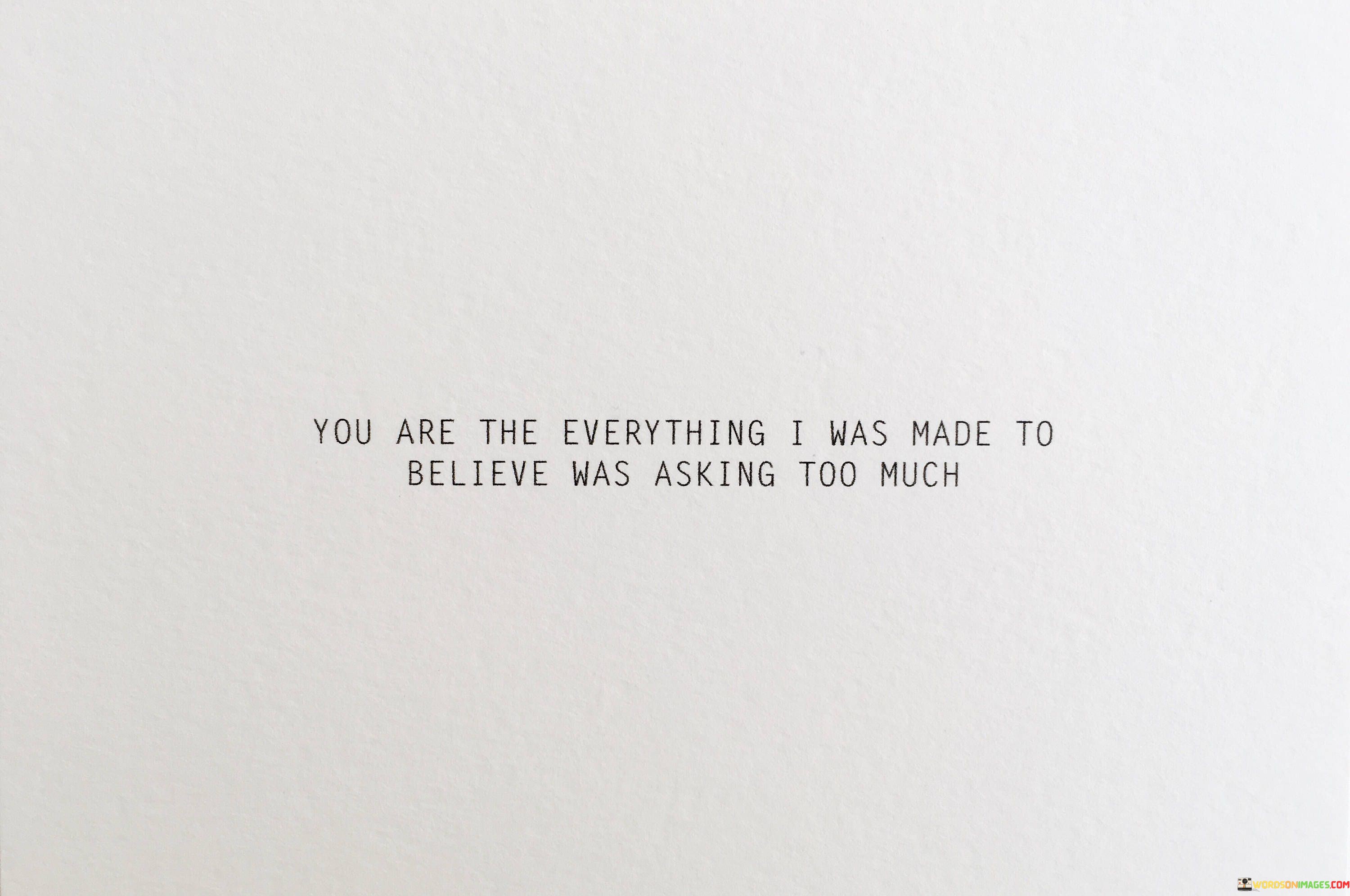This quote talks about someone being very important in the speaker's life. It means that the person they are talking about is everything they ever hoped for or expected. It's like a dream come true for them. But at the same time, it also suggests that maybe they didn't expect to find someone so amazing. It's like they didn't think they could have something so good, and now they're a bit surprised by it. So, it's a mix of feeling really lucky and maybe a little bit overwhelmed by how great this person is to them.