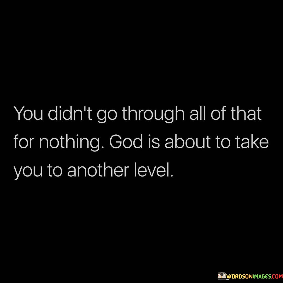 The quote "You Didn't Go Through All Of That For Nothing, God Is About to Take You to Another Level" offers a message of hope, resilience, and faith in the face of challenges. It suggests that the difficulties and trials one has experienced in life have a purpose and are preparing them for a higher, more significant phase.