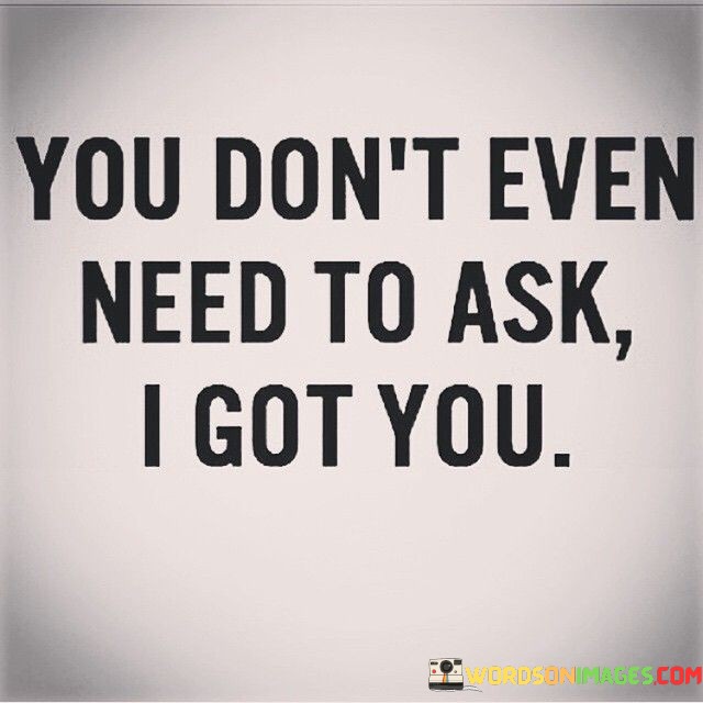 The quote underscores a sense of trust and assurance. It's not about waiting for someone to seek help; it's about anticipating needs and stepping in. This statement signifies a strong bond where the speaker is ready to provide aid, highlighting the value of true companionship and the comfort of knowing someone is looking out for you.