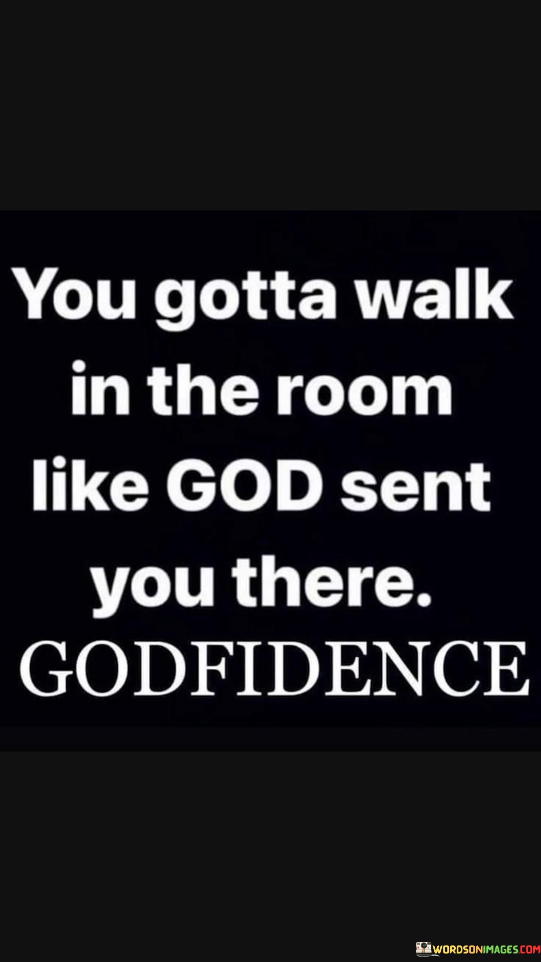 In the first 50-word paragraph, it implies that when individuals enter a room or engage in various situations, they should do so with a sense of purpose and self-confidence, akin to feeling guided or appointed by a higher power. This perspective emphasizes the idea of self-assuredness and divine guidance.