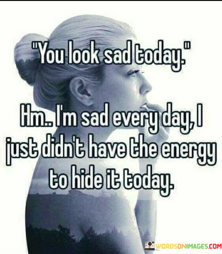 The quote reflects the hidden struggles of dealing with sadness. "Look sad today" implies external observation. "Sad every day" conveys persistent inner turmoil. "Didn't have the energy to hide it today" highlights the effort required to conceal one's emotions, emphasizing the emotional exhaustion.