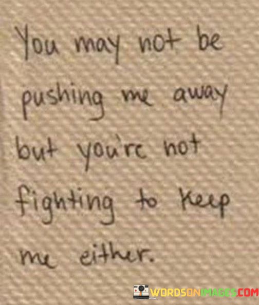 This quote reflects a sense of emotional distance in a relationship. In the first 40-word paragraph, it implies that while someone may not be actively pushing the speaker away, they also aren't putting in the effort to actively maintain or nurture the connection.