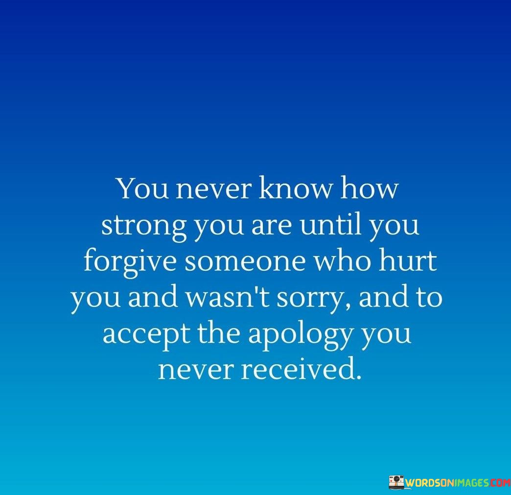 The quote highlights the resilience found in forgiveness and the ability to find strength in forgiving those who have hurt us, even without receiving an apology. It implies that letting go of resentment and embracing acceptance can reveal inner strength. In the first paragraph, the quote introduces the concept of strength through forgiveness.