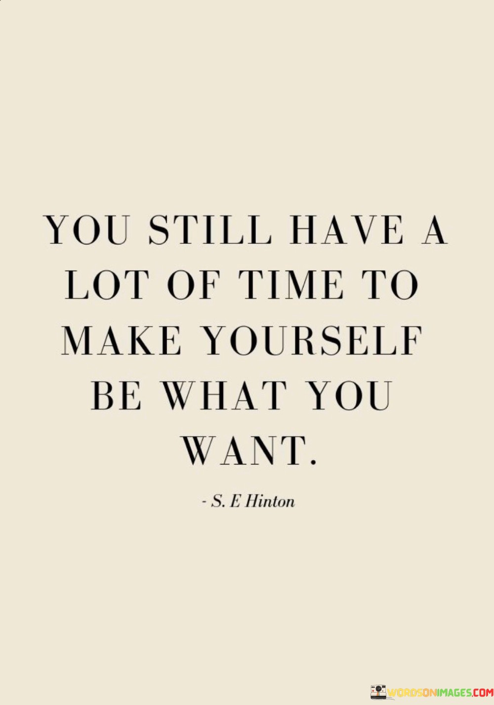 The statement promotes self-discovery and empowerment. "You Still Have A Lot Of Time" suggests a journey of self-evolution. "To Make Yourself Be What You Want" emphasizes the agency to pursue aspirations and create a fulfilling life.