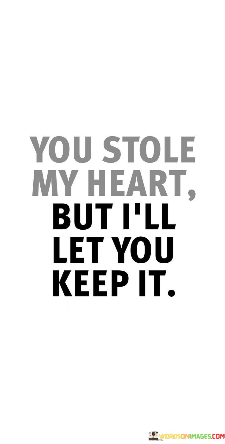 The quote "You stole my heart but I'll let you keep it" carries a sense of affection and vulnerability. It suggests that someone has become deeply enamored with another person, to the point where their heart feels taken or "stolen." However, they willingly choose to let the person keep it, which symbolizes an act of trust and love.