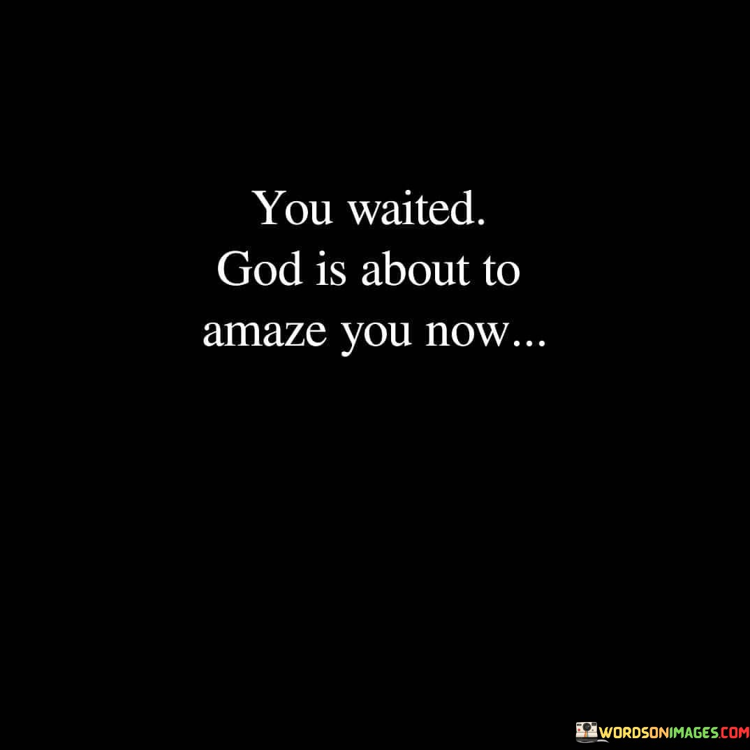 Your patience is on the verge of being rewarded; the period of waiting is coming to an end. God's designs are poised to astound you. The duration of anticipation is transforming into a time of wonder. Get ready for the extraordinary and surprising.