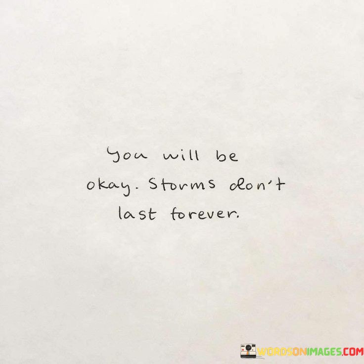 The quote "You Will Be Okay, Storms Don't Last Forever" is a message of hope and resilience. It reassures individuals facing difficult or turbulent times that their challenges are temporary and that they have the strength to weather the storms of life.