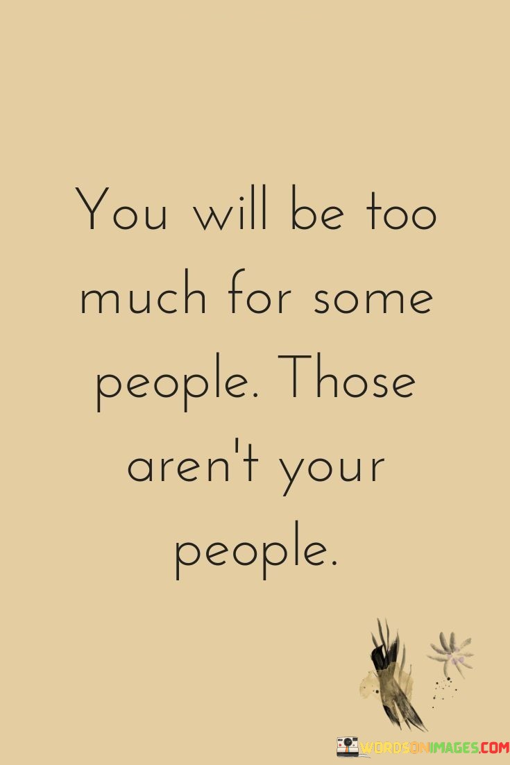 The quote addresses compatibility and authenticity in relationships. The phrase "you will be too much for some people" acknowledges that not everyone will resonate with or appreciate an individual's full personality.