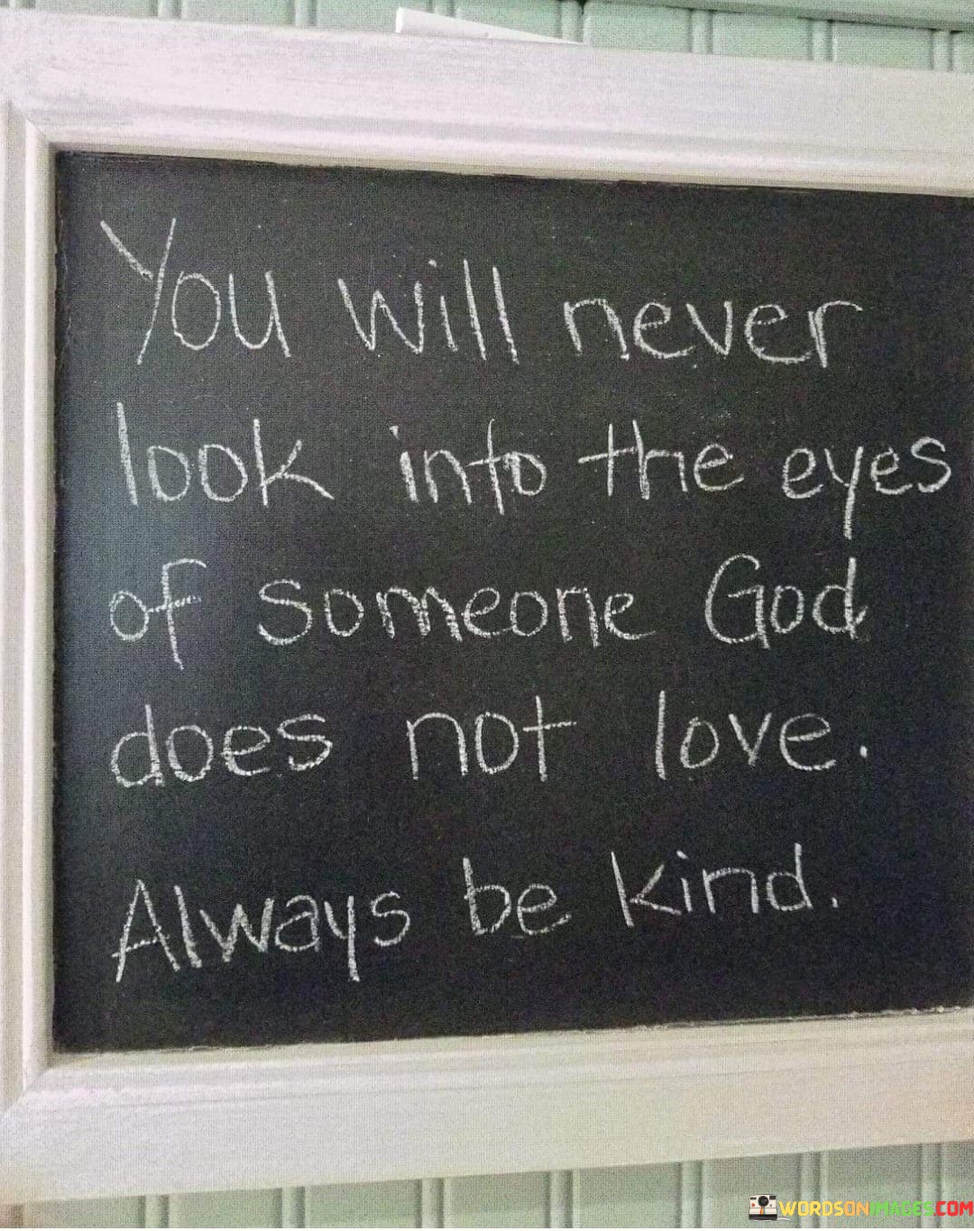 In essence, "You will never look into the eyes of someone God does not love; always be kind" serves as a reminder of the universal love and value attributed to each person by a higher power. It signifies the importance of practicing kindness as a way of reflecting and sharing God's love with others.