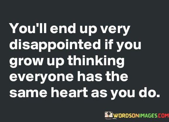 The quote cautions against assuming everyone shares the same kindness or intentions. "Very disappointed" warns about the consequences of this misconception. It highlights the potential disillusionment when encountering differing motives or behaviors, emphasizing the importance of realistic expectations in relationships.
