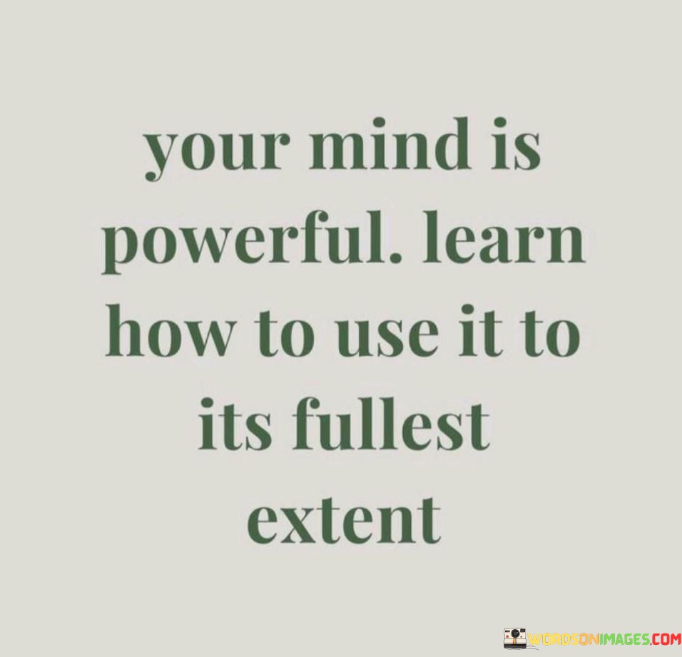 The quote "Your mind is powerful. Learn how to use it to its fullest extent" emphasizes the incredible potential of the human mind and encourages individuals to harness its power to achieve their goals and aspirations. It speaks to the capacity of the mind for learning, creativity, problem-solving, and resilience. By understanding and developing the mind's capabilities, individuals can unlock their full potential and lead fulfilling and successful lives. At its core, the quote celebrates the vast capabilities of the human mind. The mind is a remarkable tool that enables us to process information, make decisions, and adapt to new situations. By recognizing the power of the mind, individuals can cultivate a growth mindset and embrace continuous learning and self-improvement. Moreover, the quote speaks to the importance of honing one's mental abilities. Like any skill, using the mind to its fullest extent requires practice and dedication. By engaging in activities that challenge the mind, such as learning new skills, reading, solving puzzles, or engaging in critical thinking, individuals can expand their cognitive capacities and enhance their problem-solving skills. Furthermore, the quote highlights the significance of positive thinking and self-belief. By understanding the power of the mind to shape our thoughts and perceptions, individuals can cultivate a positive outlook and develop self-confidence. Positive thinking can fuel motivation, resilience, and the determination to overcome challenges and achieve goals.Additionally, the quote emphasizes the potential for creativity and innovation within the human mind. When individuals tap into their creativity and imagination, they can come up with innovative solutions and ideas that contribute to personal growth and societal progress. In conclusion, the quote "Your mind is powerful. Learn how to use it to its fullest extent" celebrates the vast potential of the human mind and calls on individuals to embrace a proactive approach towards personal growth and development. By recognizing the power of the mind and engaging in continuous learning and self-improvement, individuals can unlock their full potential and lead fulfilling lives. It encourages the cultivation of a growth mindset, positive thinking, and creativity, all of which contribute to a successful and meaningful existence. Ultimately, the quote serves as a reminder of the limitless possibilities that lie within each individual's mind and the profound impact that can be achieved by using it to its fullest extent.