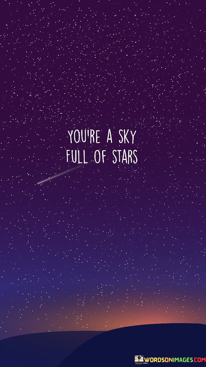 Overall, "You're A Sky Full Of Stars" is a poetic way of expressing admiration and appreciation for someone's uniqueness and the positive impact they have on others. It's a beautiful reminder that each of us has the potential to shine brightly and make the world a more beautiful place.