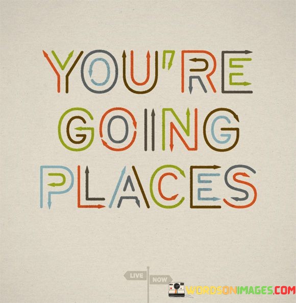 The quote "You're Going Places" is an encouraging and optimistic statement that expresses the belief in someone's potential for success and achievement. It implies that the person being addressed has a bright future ahead and is on a path to accomplish great things.