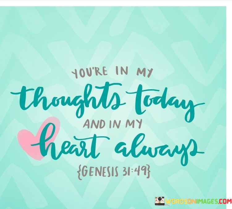 The heartfelt expression "you're in my thoughts today and in my heart always" conveys a deep sense of affection and connection. It signifies that the person being addressed occupies a special place in the speaker's life, both in their thoughts and emotions, regardless of the circumstances. The phrase "you're in my thoughts today" indicates that the person is actively on the speaker's mind at the present moment. They are thinking about them, reflecting on shared memories, or simply sending them positive wishes and well-being. This acknowledgment emphasizes the significance of the bond between the speaker and the recipient, and it serves as a gesture of care and concern. The second part of the quote, "and in my heart always," carries a profound sense of everlasting love and emotional attachment. It signifies that the person holds a permanent and cherished place in the speaker's heart, no matter the distance or time that may separate them. This sentiment reflects a deep and enduring connection that transcends the boundaries of physical presence. By combining thoughts and emotions, the quote emphasizes the genuine and authentic nature of the relationship. It suggests that the speaker not only cares about the person but also holds a genuine and unwavering affection for them. Overall, the quote "you're in my thoughts today and in my heart always" communicates a powerful message of love, care, and lasting connection. It conveys a sense of presence and emotional closeness, even when physical distance may keep them apart. It serves as a heartwarming reminder of the depth of the relationship and the significance of the bond shared between the speaker and the person they hold dear.