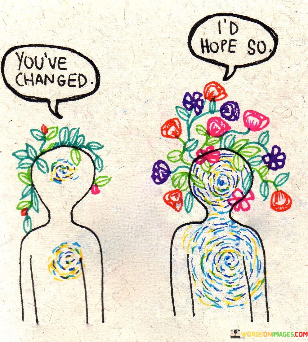 Change reflects maturity. In this context, change can signify that you've matured and become wiser. It implies that you've learned from your experiences and have adapted accordingly. So, when someone responds with, "I'd hope so," they may be expressing their expectation that you continue to learn and grow.