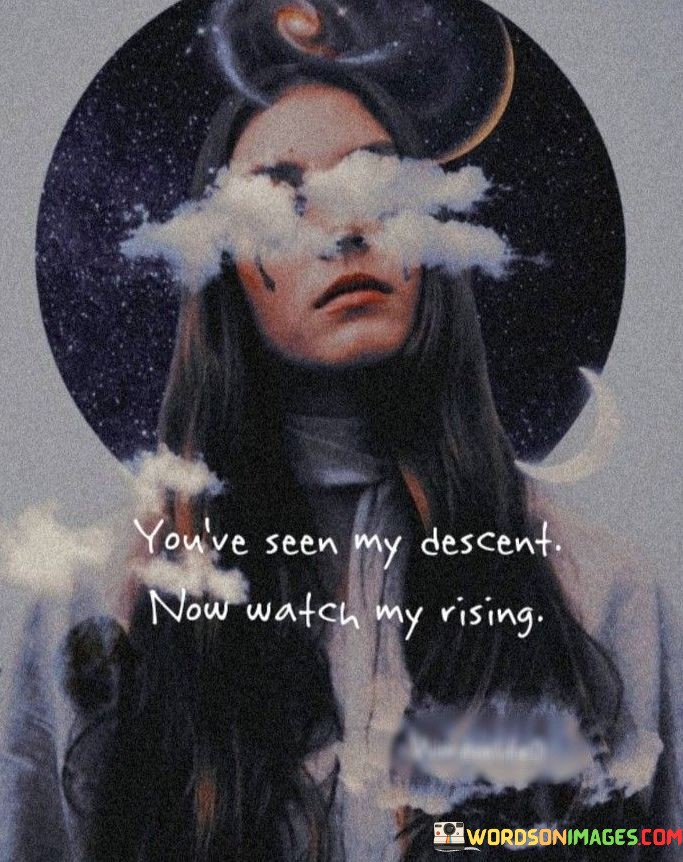 In summary, the quote "you've seen my descent, now watch my rising" represents an unwavering spirit of resilience and determination. It symbolizes the speaker's refusal to be defined by past struggles and signals their readiness to conquer new heights. It invites others to witness their journey of growth and transformation, inspiring others to embrace their own potential and overcome adversity. Ultimately, the quote highlights the power of personal triumph in the face of challenges and serves as a reminder of the resilience and strength that lie within us all.