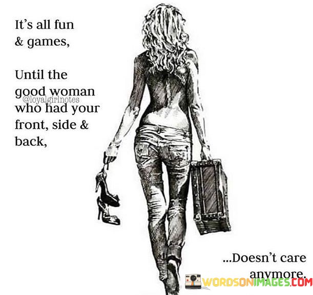 This quote uses a playful and lighthearted expression to highlight a more serious underlying message about the value of a good woman's support and loyalty. The phrase "it's all fun and games" suggests that in certain situations or relationships, things may seem carefree and enjoyable, often without fully recognizing the importance of someone's presence and loyalty. The quote then introduces the concept of a "good woman" who has your "front side and back," symbolizing unwavering support and protection. This phrase implies that this woman is deeply devoted, offering support not only in times of joy but also in times of challenges and struggles. It suggests that her loyalty and commitment are truly valuable, and when taken for granted, the "fun and games" may fade away, leaving behind a void that could have been filled by her steadfast presence.
