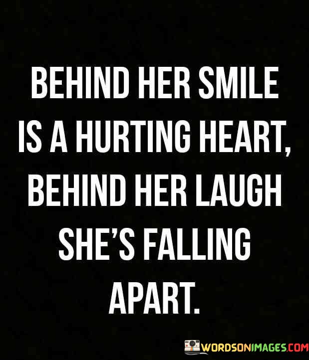 This quote poignantly captures the hidden pain and struggles that can lie beneath a person's outward demeanor. The phrase "behind her smile is a hurting heart" suggests that even when someone appears happy and content on the surface, they may be concealing deep emotional pain and sorrow within. This could be due to various personal challenges, disappointments, or traumas that they choose not to openly express or share with others. Similarly, the phrase "behind her laugh she's falling apart" underscores that someone's laughter and apparent joy may be masking inner turmoil and vulnerability. They might be grappling with feelings of sadness, anxiety, or despair despite putting on a brave face and pretending everything is fine. The quote serves as a reminder that we often don't truly know what others are going through, as people can be skilled at concealing their pain, and it encourages empathy and compassion towards others, as well as the importance of reaching out and supporting those who may be silently struggling.This quote speaks to the complexity of human emotions and the masks people sometimes wear to protect themselves or shield their vulnerabilities from the outside world. It reminds us of the importance of looking beyond the surface and understanding that a smiling or laughing facade does not always reflect a person's true emotional state. We should approach others with sensitivity, offering a listening ear and a caring heart, as they may be silently grappling with their own battles. This quote also highlights the significance of open communication and creating safe spaces where people can express their feelings without judgment or fear of rejection. By acknowledging the pain that may lie behind someone's smile or laughter, we can foster a more compassionate and understanding community, where individuals feel seen, heard, and supported in their moments of vulnerability