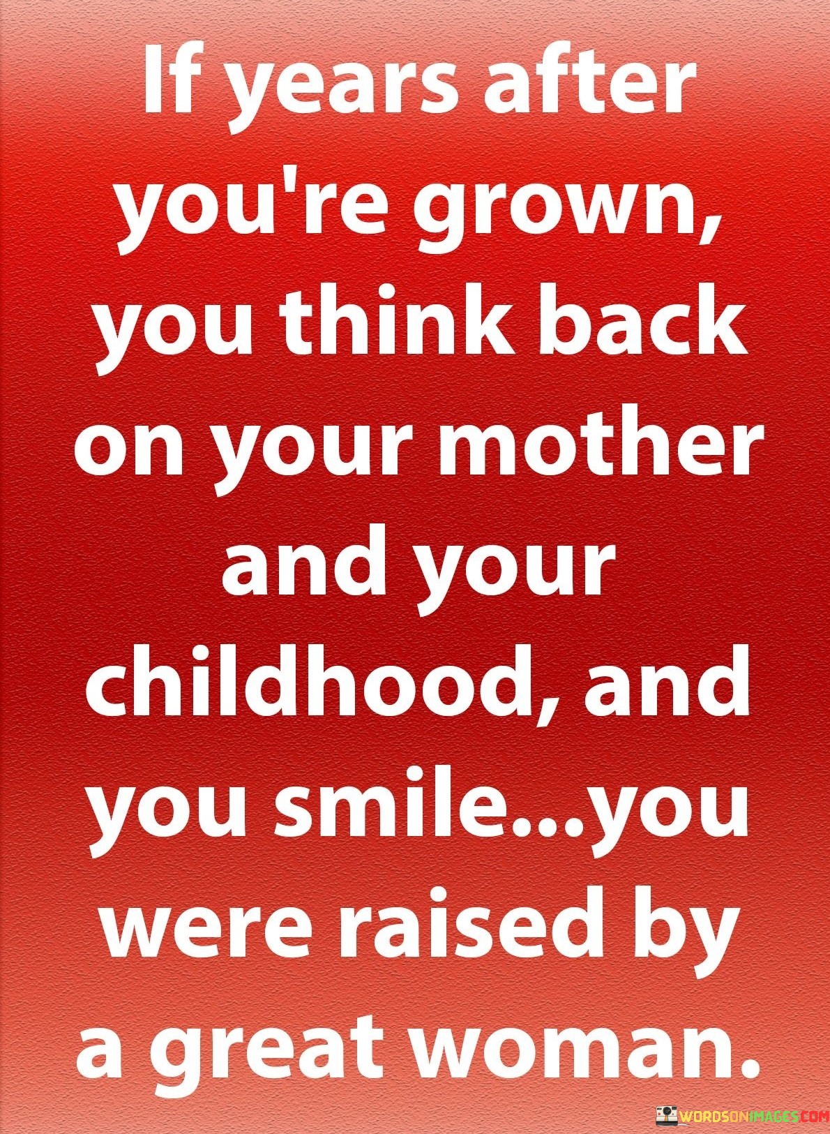 This quote reflects on the profound impact a mother can have on her children and the enduring legacy she leaves behind. It suggests that if, even years later when one is grown and reflecting on their mother and childhood, the memories bring a smile to their face, it is a testament to being raised by a great woman. The quote emphasizes the significance of a mother's influence and the role she plays in shaping her children's lives.