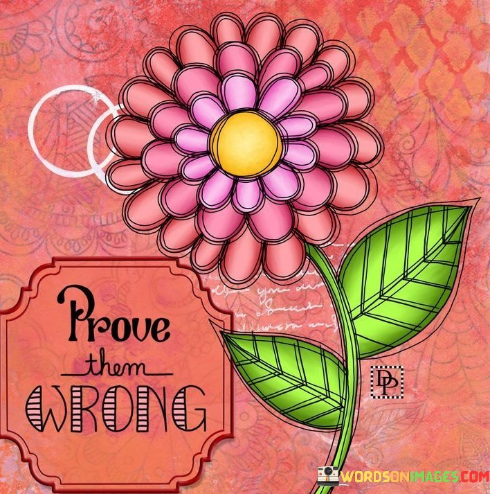 This quote encourages us to demonstrate our capabilities and achieve success despite doubts or skepticism from others. It's about using negative opinions or disbelief as motivation to excel. When people doubt our abilities or tell us we can't do something, "Prove Them Wrong" serves as a reminder to stay determined and show them that we are capable of achieving our goals.
